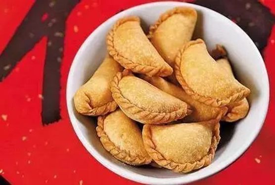 开油锅炸油角意味着来年的生活像油锅一样,油油润润、富富足足。油角的形状像荷包一样寓意着钱包的意思,里面装满芝麻砂糖、豆沙或者椰蓉,昭示着来年大家在外谋生,个个都能赚钱赚到盆满钵满。