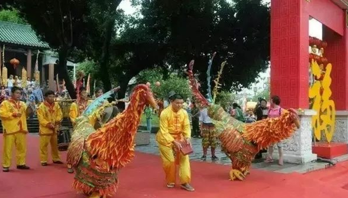双凤舞首先由引凤人手持一木盒,引领双凤上场,凤随着锣鼓节奏起舞,时而引颈长鸣、飞扑跳跃,时而交颈扫羽、妙舞相嬉,形象栩栩如生。在祠堂舞完后,引凤人还会拿着拜匣引领双凤穿山过寨,登门到户作舞,以示驱邪消灾,迎祥纳福。(素材图片来源网络)