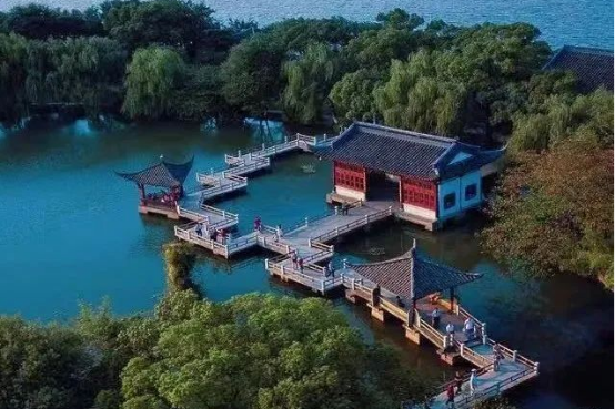 西湖的桥形态多样,行走其间,饶有兴味。“小瀛洲九曲桥”曲折有致、步移景异,连接南北,九转三回三十个弯,在迂回多变的曲桥上,串联着“开网亭”“亭亭亭”等,引人渐入佳境。