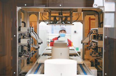 山东省东营经济技术开发区山东国瓷功能材料股份有限公司,AI工业视觉识别品质检测系统正在对生产出的汽车用蜂窝陶瓷颗粒捕捉器产品进行质量检测。