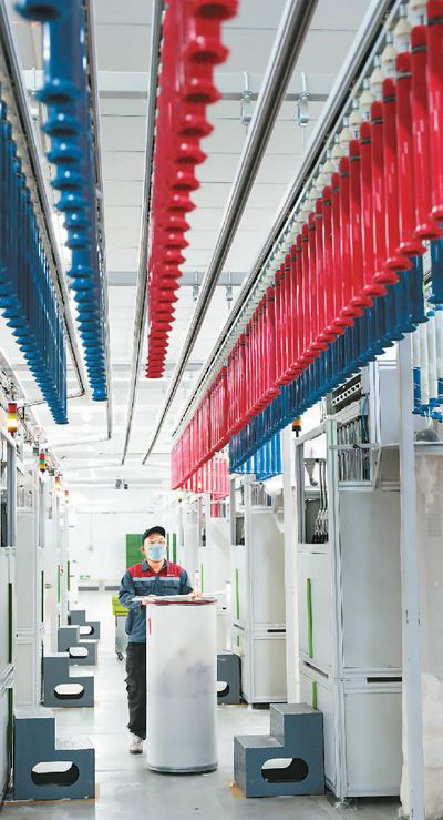 位于安徽省蚌埠市五河县经济开发区的华芳五河纺织有限公司生产车间内,工人在生产线上忙碌。该企业引进国际先进的技术设备,加快推动纺织生产数字化转型,打造出绿色环保、智能化的智慧生产线。