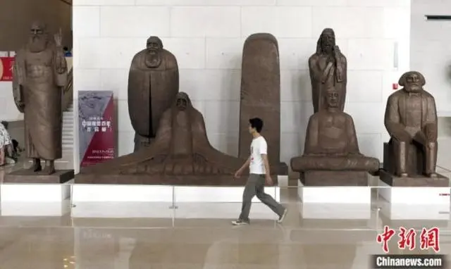 参观者在中国“国博百年·中国雕塑百年作品展”里一件作品前走过,这件雕塑将苏格拉底、孔子、老子、耶稣、释迦牟尼、马克思等古今中外圣贤排列到了一起。(图片来源:中新网)
