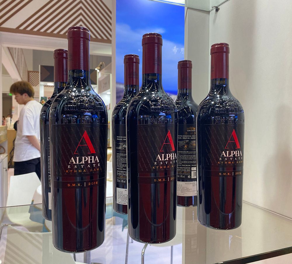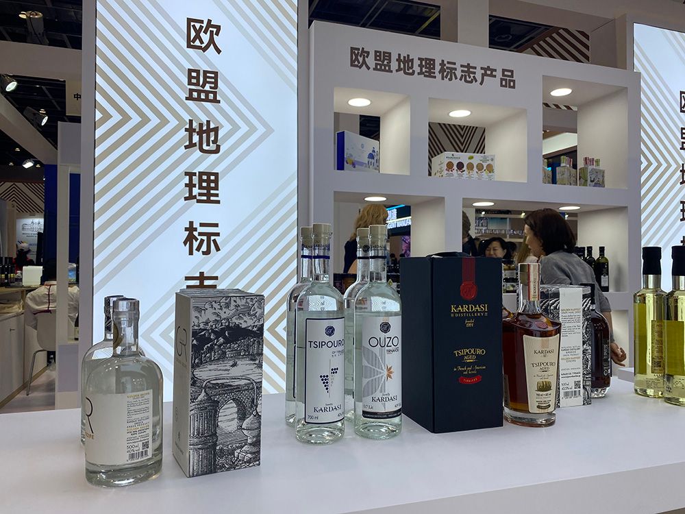 图为乌佐茴香酒等欧盟地理标志产品在博览会上展出。(本文图片均由希中网记者叶轻 摄)