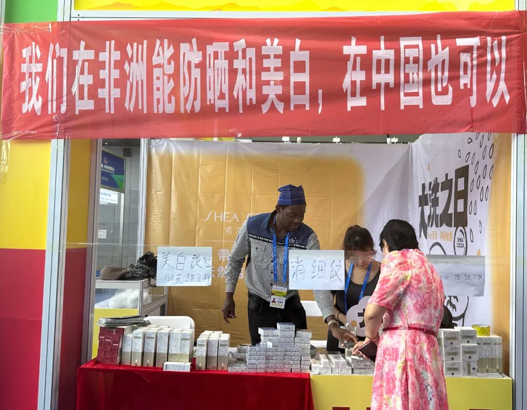 非洲企业和商品馆内,李家远和马里共和国的小伙子阿马在展台前打了一段非洲鼓,几位非洲姑娘应声起舞,引来围观者阵阵掌声。而另一处卖护肤品的展位拉起红色条幅,上写“我们在非洲能防晒和美白,在中国也可以”,摊主的幽默迅速引来一堆顾客。