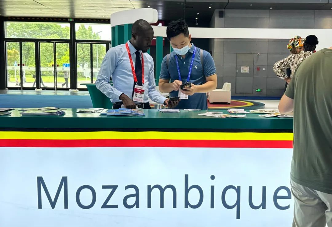 中非经贸博览会莫桑比克展馆内,中国参展商在咨询。拍摄:静玄