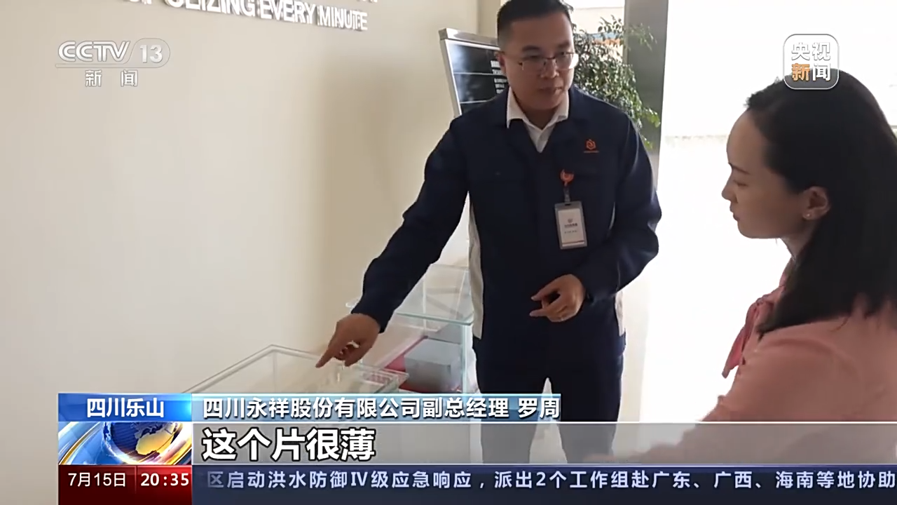 四川永祥股份有限公司副总经理 罗周:我们最初的时候,只能做出太阳能级的三级,勉勉强强能够够得着去做光伏产品,现在我们已经突破了这个标准了,甚至我们一部分产品是满足电子一级的产品质量。
