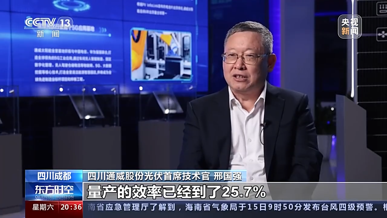 四川通威股份光伏首席技术官 邢国强:我们的电池效率在10年前大概也就是18%,现在我们TOPCON上量产的效率已经到了25.7%。十年间,我们增加了将近8个百分点,这是一个巨大的技术进步。我们在规模上,我们在质量上都走在了行业的最前列。