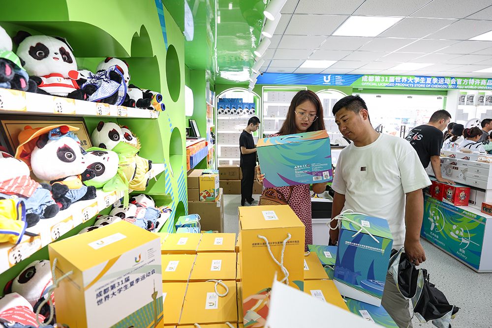 8月1日,游客在位于春熙路的成都大运会官方特许商品零售店内选购吉祥物“蓉宝”纪念品。(图片来源:中新社)