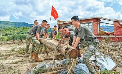 8月8日,吉林省舒兰市开原镇,陆军第78集团军某旅党员突击队队员在清理杂物。