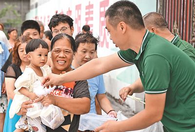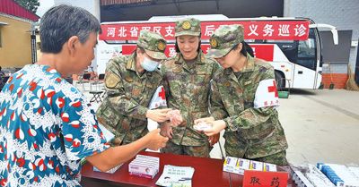8月9日,河北省军区石家庄第三干休所医生为当地受灾群众义诊并发放药品。