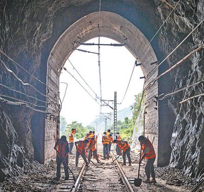 8月7日,北京市门头沟区王平镇,中国铁路北京局北京西工务段工作人员在清理路基和轨道。