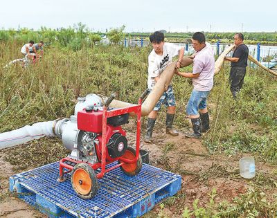 日前,河北省邢台市南和区农业农村局农技推广员帮助受灾养殖户进行鱼塘合理排涝。