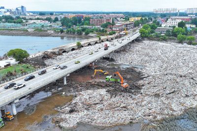 8月7日,北京市房山区琉璃河桥,大型机械在清理水面漂浮物,疏通河道。