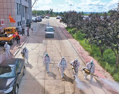 8月8日,黑龙江省尚志市,工作人员对洪水过后的道路进行消毒。