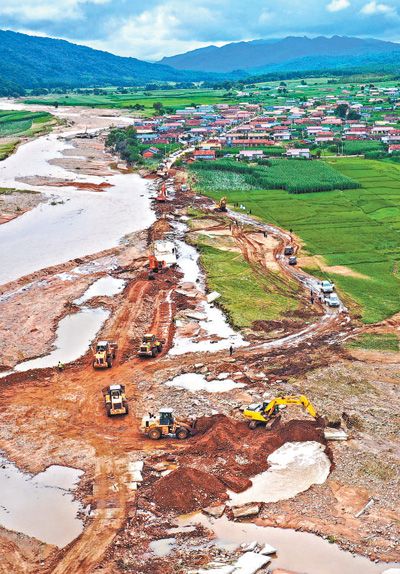 8月6日,在通往吉林省舒兰市青松林场的村道上,大型机械在抢修水毁道路。
