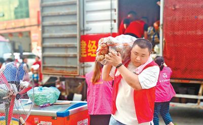 8月6日,河北省涿州市码头镇向五村,天津市阿米玛玛何庄子农产品批发市场工作人员为受灾群众免费提供盒饭。