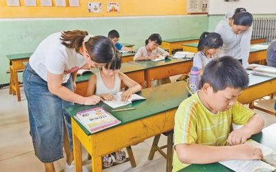 8月8日,河北省献县乐寿镇东翟小学安置点内,学校老师为学生辅导功课。