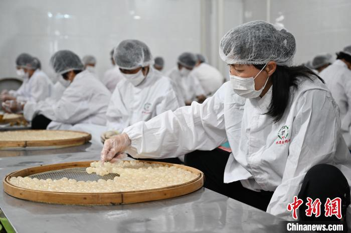 7月11日,广东省茂名市高州市分界镇的村民将龙眼剥壳去核。中新社记者陈楚红摄