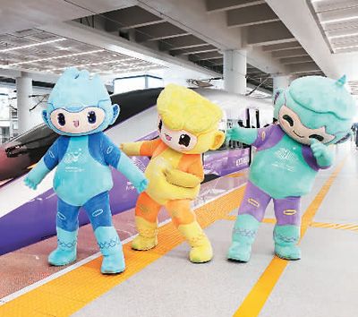 杭州亚运会吉祥物与复兴号亚运智能动车组列车合影留念。