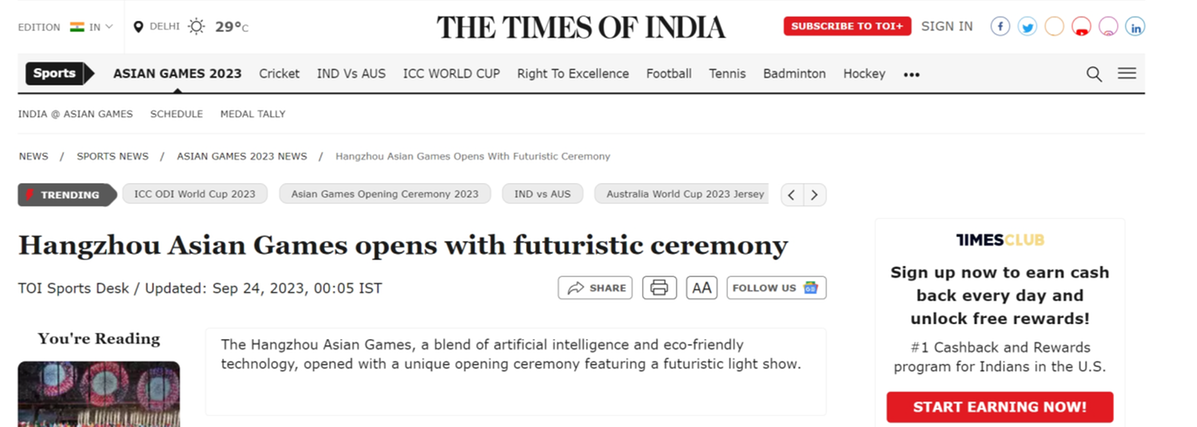 《印度时报》网站报道称,融合人工智能和绿色科技的杭州亚运会开幕式未来感十足。