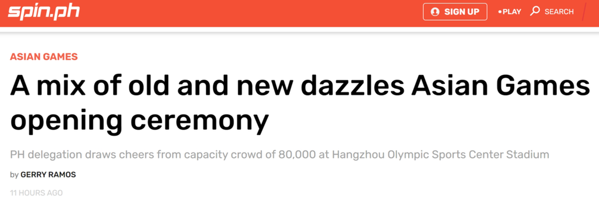菲律宾体育互动新闻网(SPIN)报道称,杭州亚运会于周六晚上在座无虚席的杭州奥体中心体育场举行了令人目炫的开幕式。