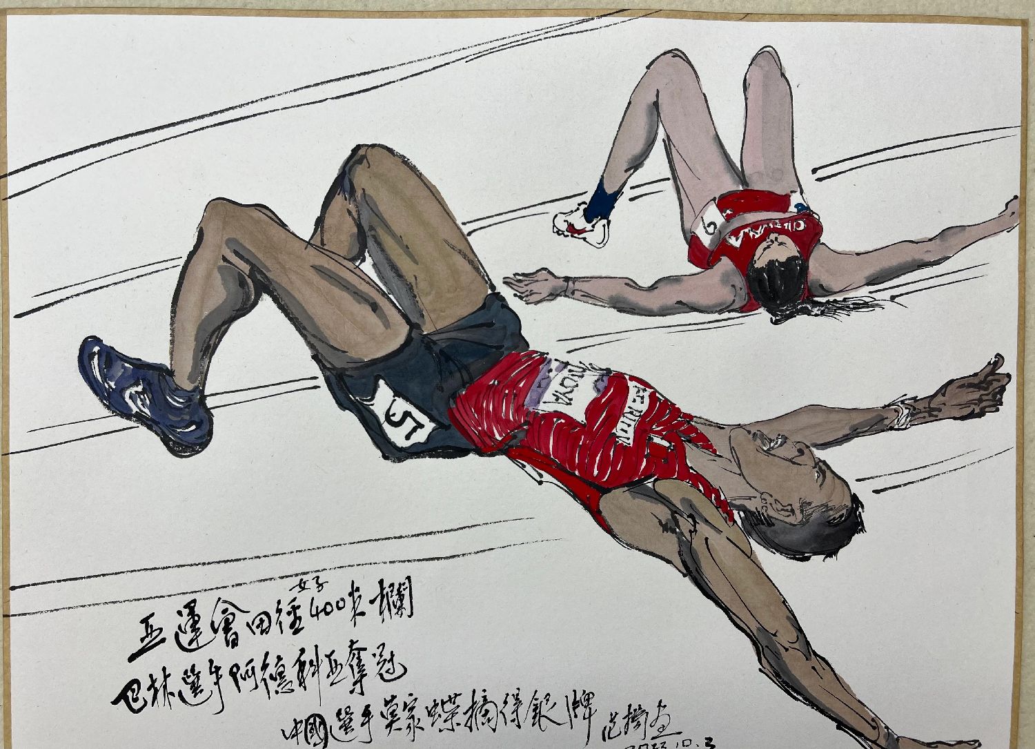 亚运会田径女子400米栏决赛中,巴林选手阿德科亚夺冠,中国选手莫家蝶摘得银牌,取得了不俗的成绩。画家画了她们冲刺后躺在跑道上的放松时刻。成绩来之不易!