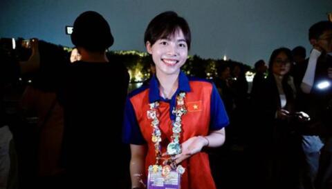 一行人登上游船二楼平台,感受秋风拂面。越南女子射击运动员费青草(PHI Thanh Thao)虽然中文并不流利,还是极力表达着对中国射击运动员黄雨婷的喜爱。她还向记者展示在亚运会期间收获的各式徽章。