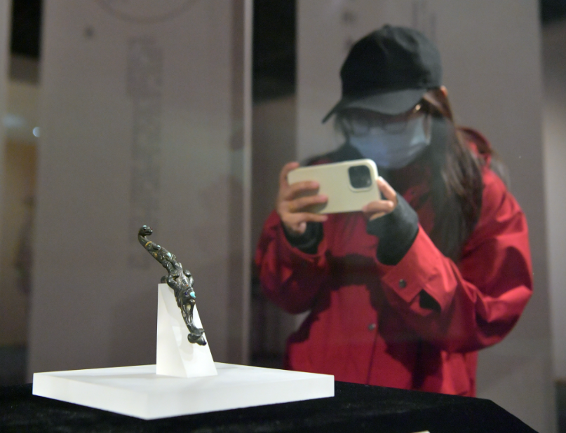 10月31日,在“束带衿庄——吉林省博物院带具展”中,市民正在拍摄错金银“丙午神钩”铜带钩。(图片来源:刘栋摄)
