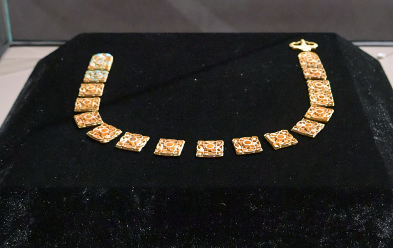 “束带衿庄——吉林省博物院带具展”中的嵌绿松石金带銙。(图片来源:刘栋摄)