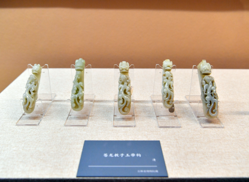 清代,带钩的实用性减弱、赏玩性增强,表达“苍龙教子”寓意的带钩甚为流行。图为展览中的一组清代玉带钩。(图片来源:刘栋摄)