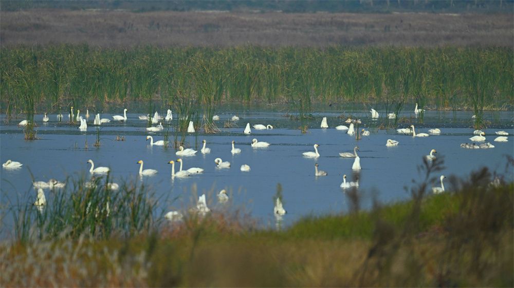 随着鄱阳湖沿线湿地环境得到有效保护,每年来此越冬的候鸟数量和种类在不断攀升,根据鄱阳湖保护区联合南矶湿地保护区、都昌候鸟保护区最新同步监测,目前共监测记录到58种水鸟,数量约60万只。