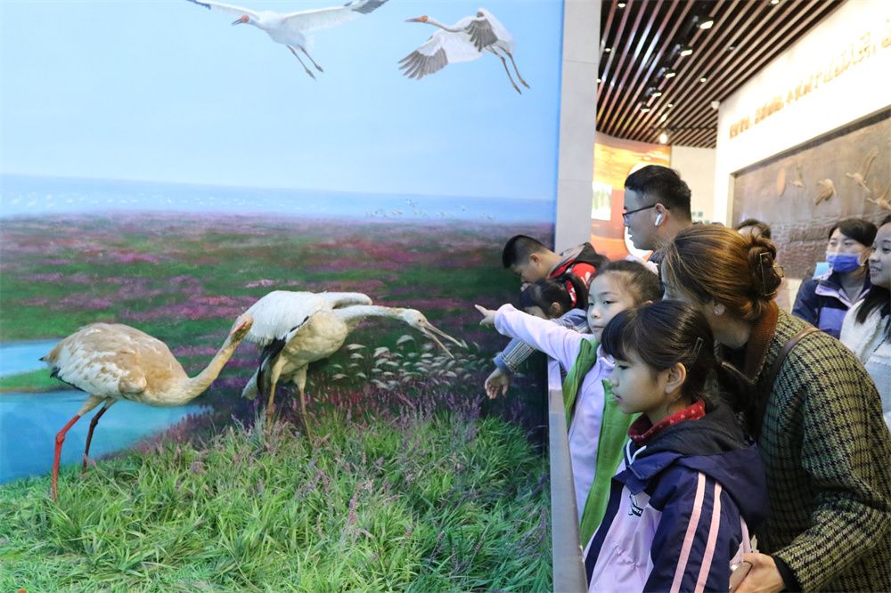 冬日清晨,江西鄱阳湖国家级自然保护区管理局吴城保护管理站,近千只白鹤如“精灵”般跃然水上,时而觅食,时而歇脚。远处,二十多米高的观鸟台上,游客举起望远镜瞄准,白鹤的身姿映入眼帘。