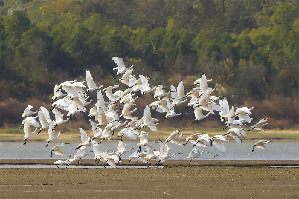 24日,成群越冬候鸟白琵鹭在鄱阳湖湖口水域飞翔、觅食。(图片来源:中新社)