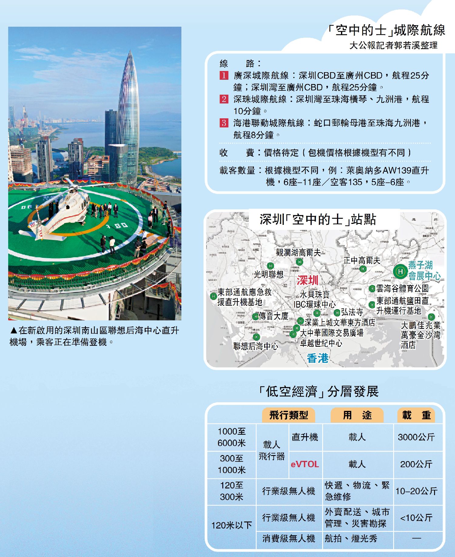 (大公報記者郭若溪深圳報道)深圳正加速布局「天空之城」,創新城市立體交通,多條城際「空中的士」直升機線相繼開通,織密灣區低空路網。近日,深圳聯想后海中心直升機場與城市候機樓正式啟用,搭乘「空中的士」由深圳灣至廣州25分鐘直達,形成深圳灣與粵港澳大灣區「9+2」城市群內各運輸機場、城市CBD、重點企業與廠區等起降點互聯互通。深圳交通部門並表示,將探索打造河套深港科技合作區與香港的跨境載人運輸通道和跨境貨運試點,持續豐富低空載人業態發展。