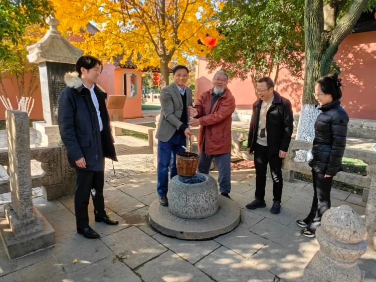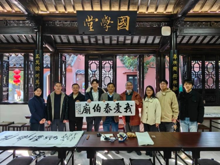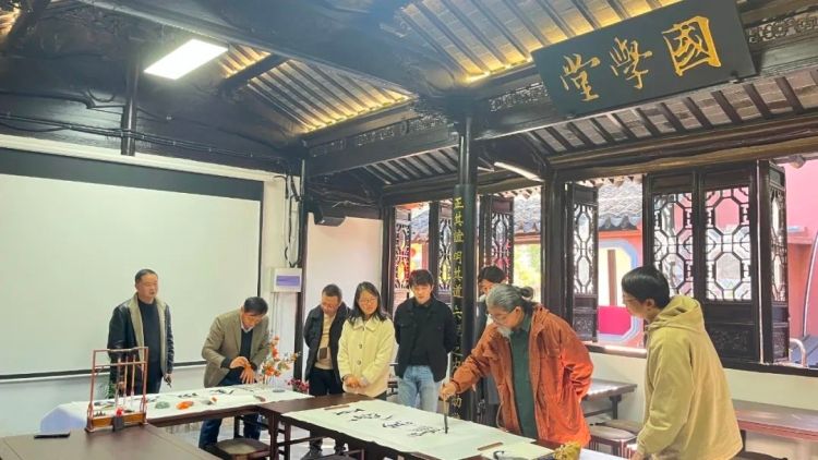 书法家在国学堂题字12月8日,中国美术教育学会会员、国家课程标准《美术》实验教材副主编、无锡市华侨书画院院委、无锡市华侨文化交流基地大华美术馆馆长华斌,中国书法家协会会员、无锡市书法家协会副秘书长、无锡市滨湖区委宣传部四级调研员、无锡市滨湖区文联秘书长何明,法籍华人、克维(无锡)总经理金一一行三人到泰伯庙参观访问,泰伯庙文化发展有限公司总经理邹旦礼,泰伯庙文化发展有限公司支部书记蔡建武、副书记储枫,无锡新华起重工具有限公司总经理王凯、无锡市天禾堂药房连锁有限公司总经理王昊等陪同参观,参加座谈交流。
