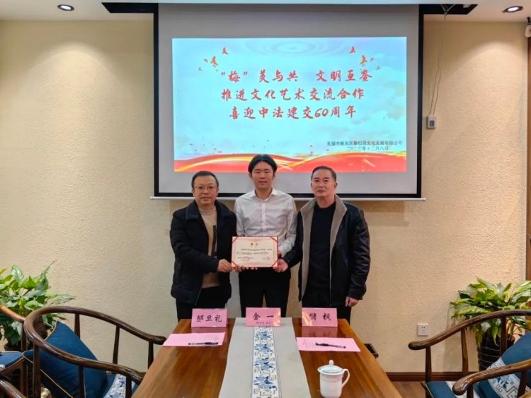 “2024年是中法建交60周年暨中法文化旅游年。双方将以两国人员往来全面重启为契机,推动文化、教育、语言、出版、影视、旅游、地方、青年等各领域交流,加强合作。”泰伯庙文化发展有限公司总经理邹旦礼感谢参会人员到泰伯庙传经送宝,他相信在与会人员共同努力下,泰伯庙将发展得更好;他表示要加强与无锡市华侨文化交流基地、无锡市华侨书画院间的合作,苦练内功,活化资源,使泰伯庙成为传承弘扬中华优秀传统文化、吴文化网红打卡地;他希望加强中法文化交流,努力为中法建交60周年暨中法文化旅游年尽公司一份力量。