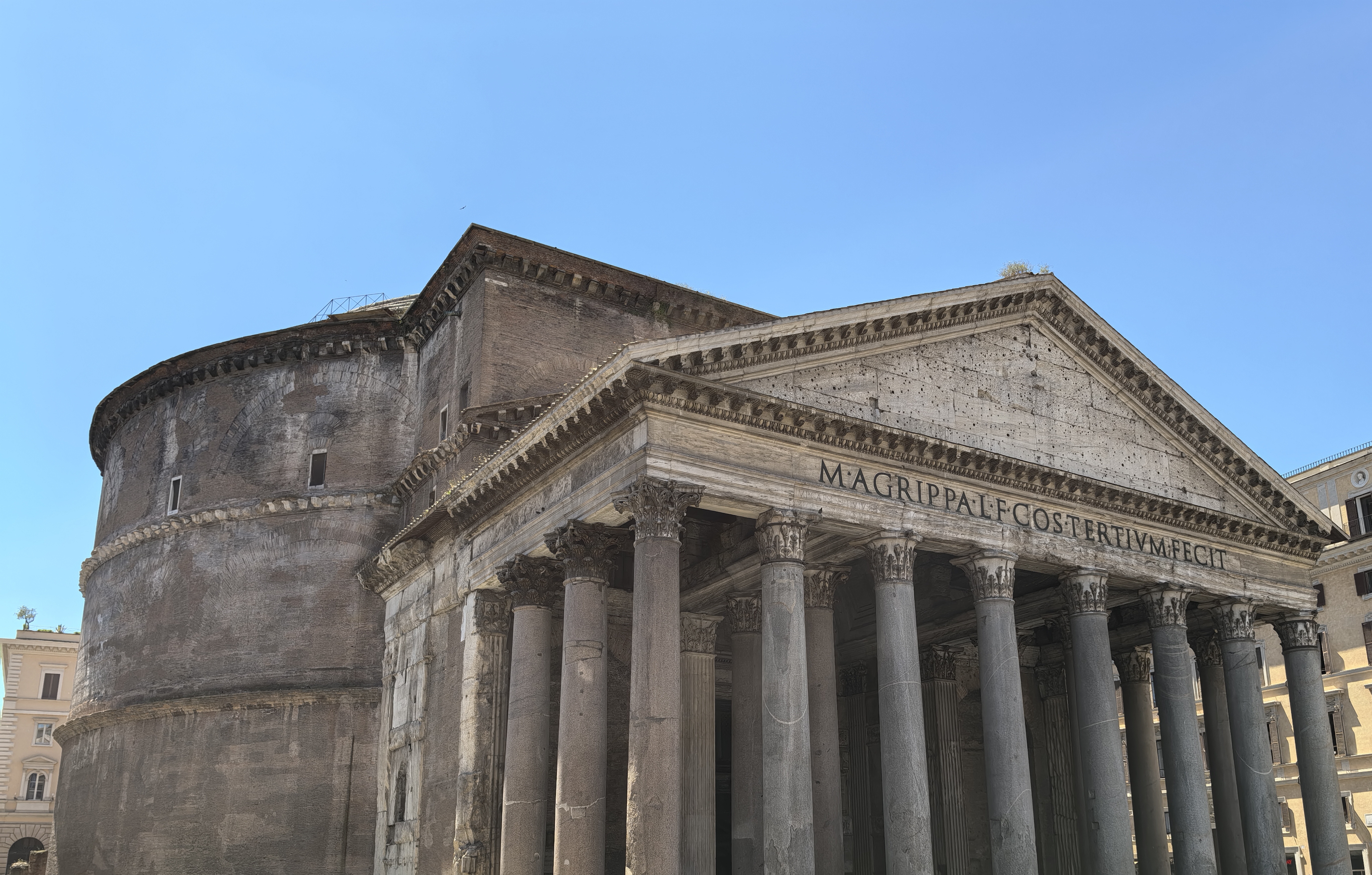 最典型的就是万神殿。作为始建于公元前27—25年,至今仍相对保存完整的古罗马时期大型公共建筑,本来用以供奉奥林匹亚山诸神,但七世纪早期又被改建为天主教堂,里面除了埋葬着文艺复兴时期的杰出画家拉斐尔,19世纪后期意大利统一后还成为国王的陵墓。穿过巨型厚重的青铜大门,一抬眼就能看到直径43.3米的巨大穹顶正中,那个直径8.9米的圆形“天眼”,这是万神殿内部惟一的光源,正午的阳光透过这个圆洞照射下来,营造出庄严神圣而又奇幻绚丽的氛围。15世纪之前,万神殿的圆顶一直是世界上最大的穹顶,直到文艺复兴时期,建筑大师布鲁内莱斯基受其启发设计建造了佛罗伦萨圣母百花大教堂的穹顶。万神殿的设计还影响了后世包括清华大学大礼堂在内许多建筑的形制。