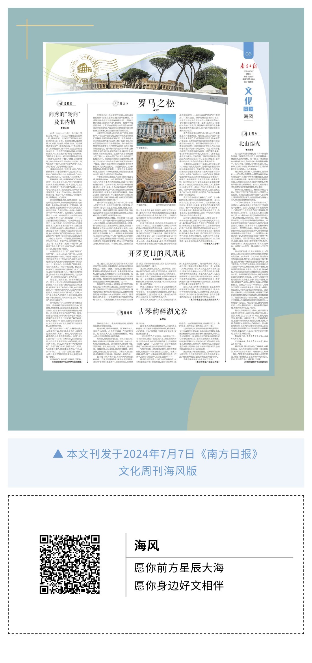 到罗马之前,我就时常在听意大利作曲家奥托里诺·雷斯庇基的交响诗《罗马之松》。当我终于漫步在罗马熙熙攘攘的大街上、徜徉于博尔盖塞公园的晨光中,看到那一株株亭亭如盖的伞松,才真切地感受到100年前作曲家所表达的创作初衷:“我以罗马自然风景中富有特征意义的松树,作为这首乐曲的描绘对象。”