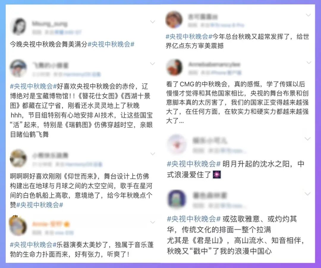 中国文艺评论家协会主席夏潮认为,“今年总台秋晚以独特的中国式审美,为观众呈现出了一场视听盛宴。通过现代科技手段,营造出唯美意象。整台晚会古今交融、古今对话的呈现方式,让观众在感受中国历史传承、风俗习惯、审美风范的同时,也看到了中华优秀传统文化在新时代创造性转化和创新性发展的生命力。”在澳大利亚的台湾同胞巫天铎说:“秋晚里有很多中华传统文化的节目,古代的词牌名、各地的民谣歌谣让人很有亲切感,展现了中国文化的魅力,让我们在海外的中国人也感到振奋。”
