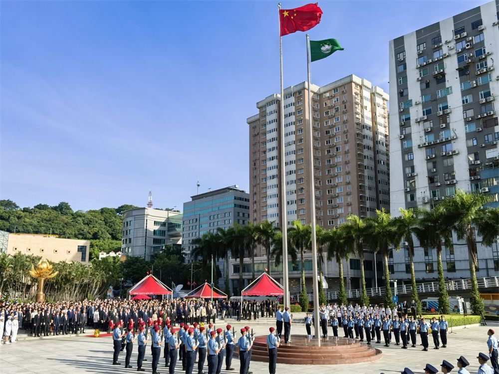 澳门特区政府1日上午分别在金莲花广场和中国与葡语国家商贸合作服务平台综合体举行升旗仪式和酒会,庆祝中华人民共和国成立75周年。