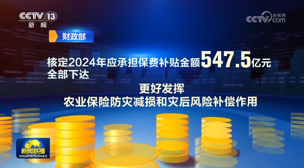 财政部日前下达2024年第二笔中央财政农业保险保费补贴预算71.4亿元,加上此前已下达的476.1亿元,核定2024年应承担保费补贴金额547.5亿元全部下达,更好发挥农业保险防灾减损和灾后风险补偿作用。