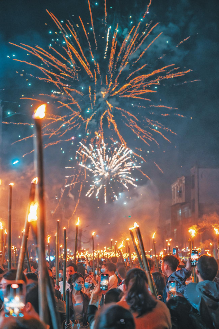 当夜幕完全笼罩,手持火把的人们从四面八方汇聚而来,瞬间形成了一条蜿蜒四五公里的火龙。熊熊燃烧的火把照亮了夜空,也点燃了人们心中的热情。