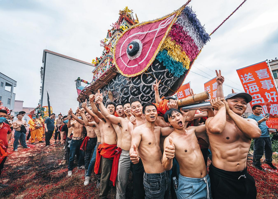 “嘿哟!嘿哟!嘿哟!”一条超过十米高的彩色花船在万人簇拥下穿过村巷,走过沃野,蹚过溪流,声声呐喊响彻云霄。花船随着数十名壮硕男子的手臂上下摇摆,起起伏伏,在人流的簇拥下,时而如同顺巨流而下,势如破竹;时而如同行驶在湍急的洪流中,逆流而上,与巨浪搏斗,场面十分震撼。