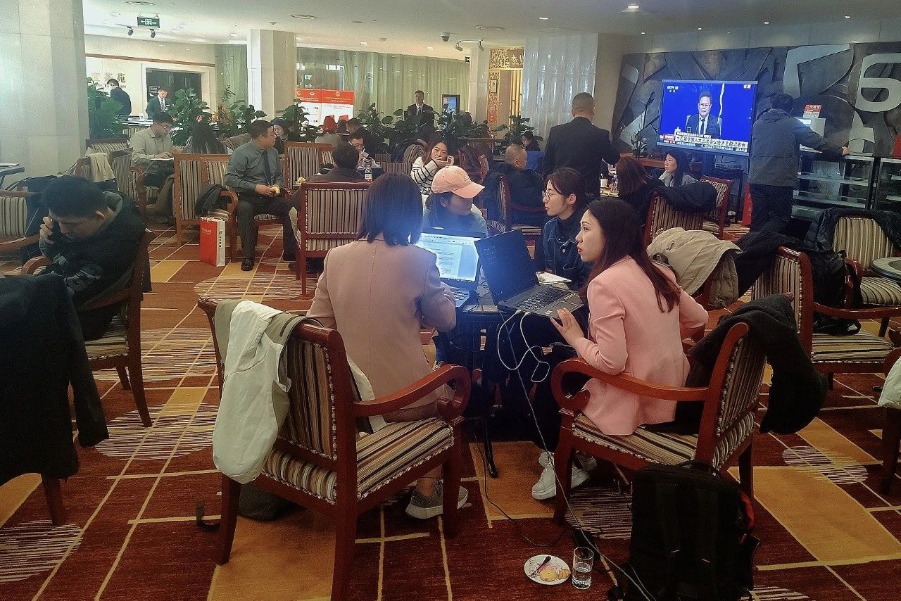旁边的茶歇处人气很旺,记者们有的在对采访设备进行最后调试;有的在笔记本电脑上运指如飞,争分夺秒地搜集最新资料;有的三三两两凑在一起,头脑风暴着选题角度和提问方式——虽忙碌不停,但有条不紊。