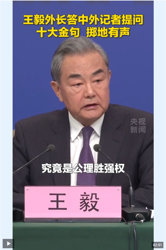 3月7日,同样在梅地亚中心新闻发布厅,十四届全国人大三次会议举行外交主题记者会,中共中央政治局委员、外交部长王毅就“中国外交政策和对外关系”相关问题回答中外记者提问,妙语连珠、精彩纷呈,再次引爆舆论场!