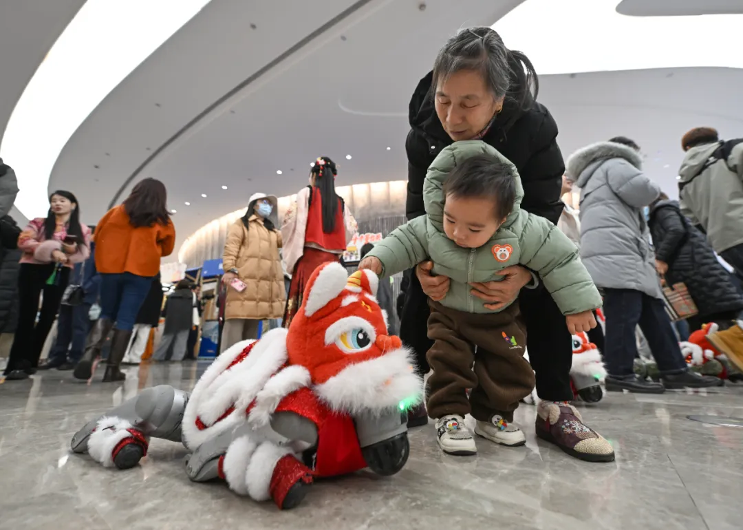 2025年2月26日,浙江杭州,展出的机器狗吸引小朋友的注意。(图片来源:中新社)
