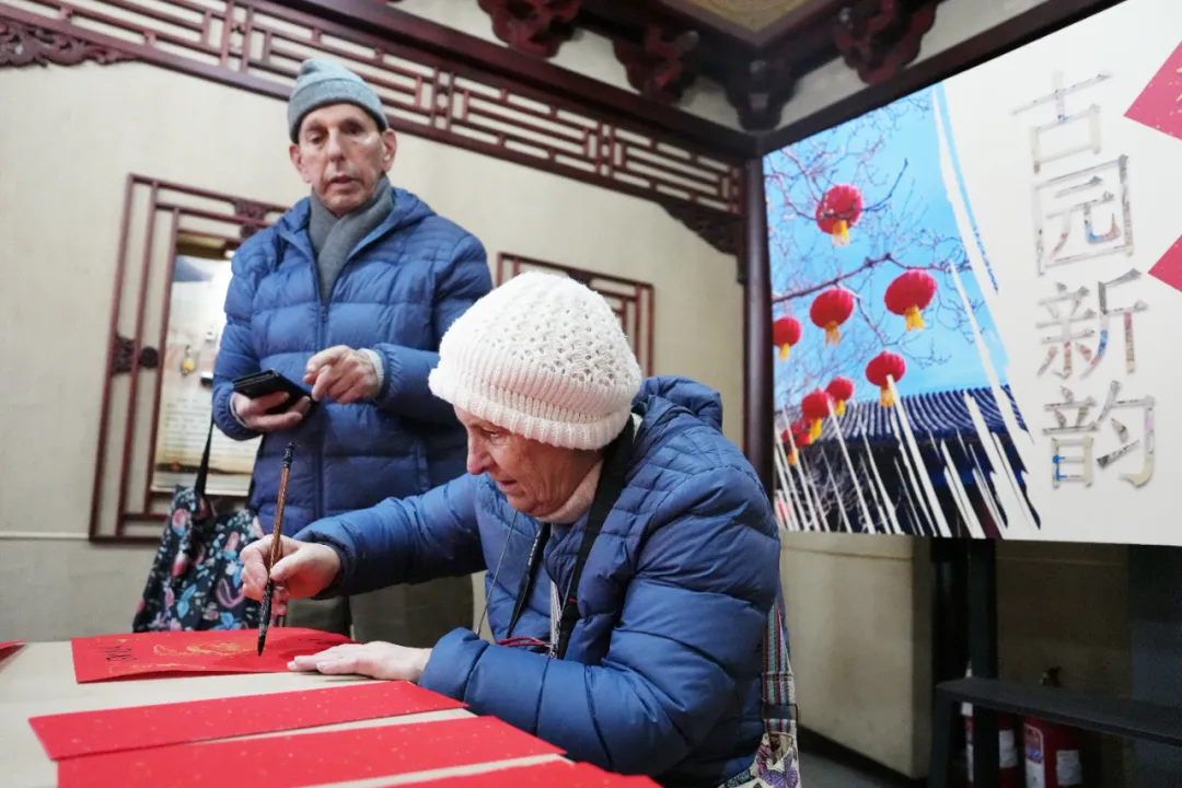 2025年2月12日,农历正月十五元宵节,外国游客在北京颐和园体验手写挥春。(图片来源:中新社)
