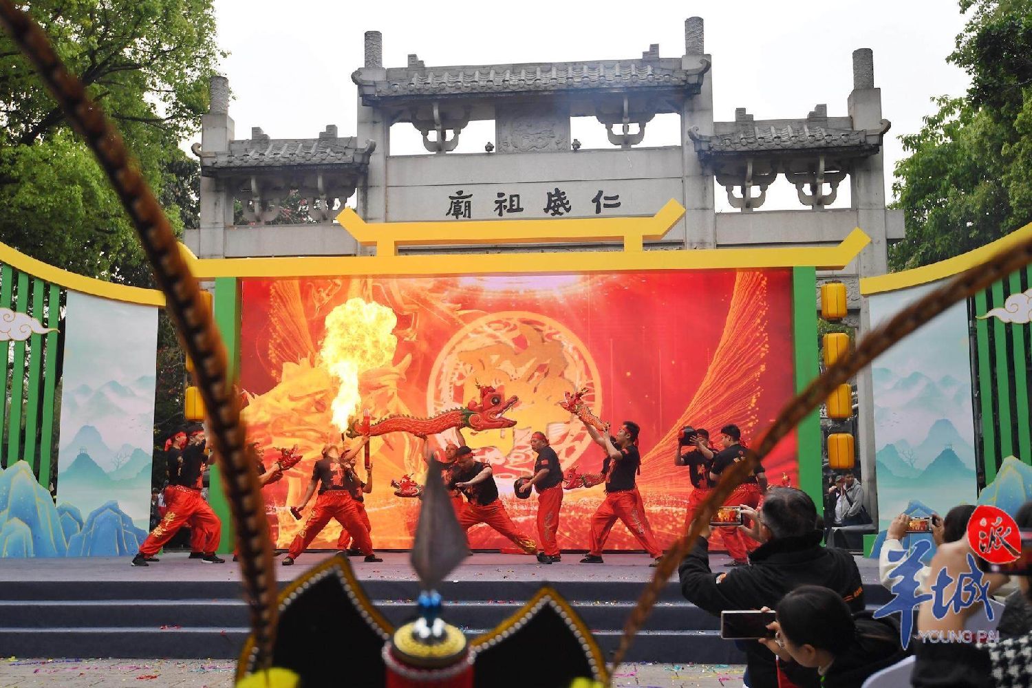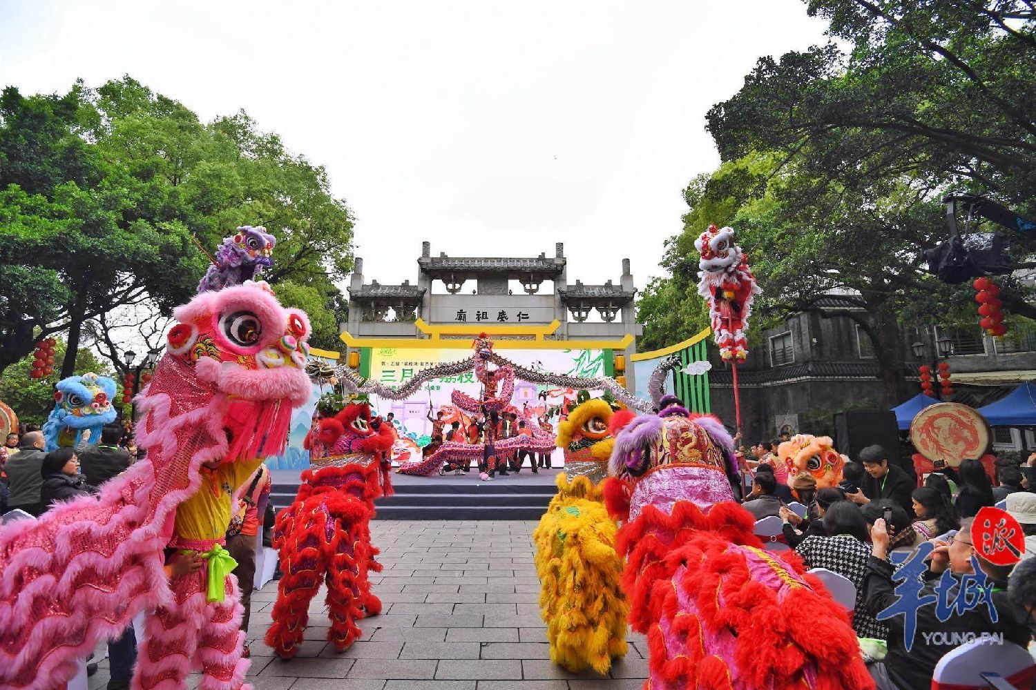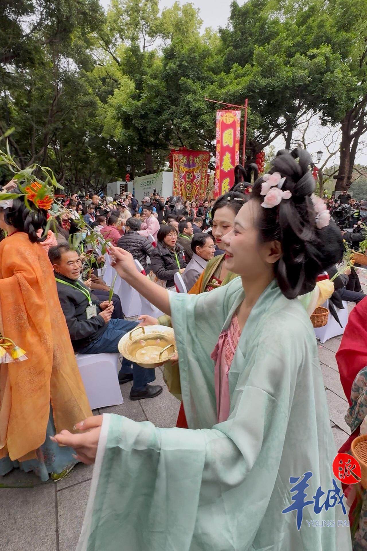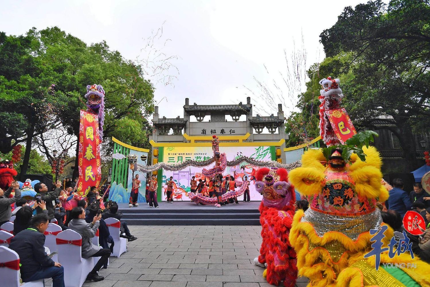 泮塘村锣鼓喧天,父老乡亲齐聚一堂,看到来宾拜访互相道贺。随后,泮塘村村民一同祈福,村中的狮队以矫健步伐舞动醒狮、踩上高桩采青;“三月三,临水祓禊”,依古礼行“祓禊礼”,10多位汉服佳人从文塔祈福归来,为现场市民以兰草净水洗去尘埃,呈现古时祓禊场景;泮塘村有威望的长者一起为醒狮点睛、切烧猪,祈愿福泽绵长。
