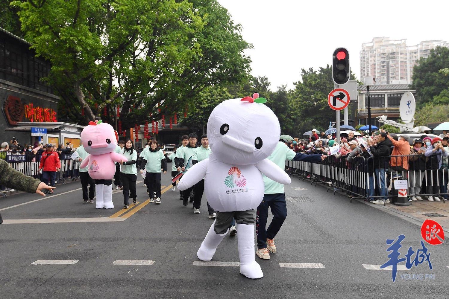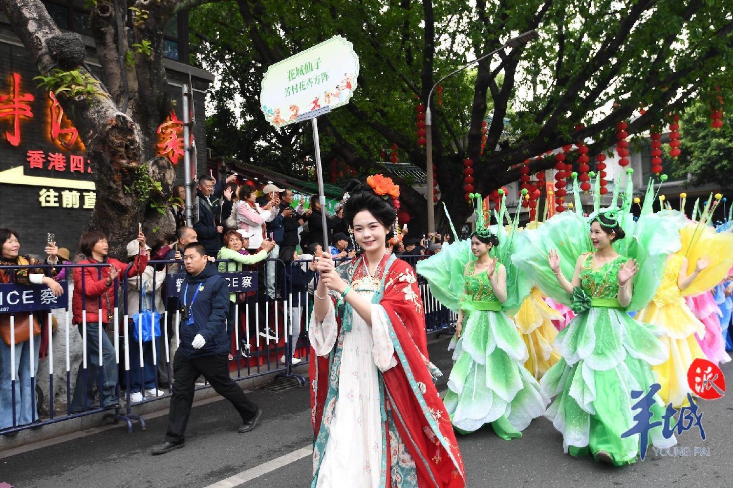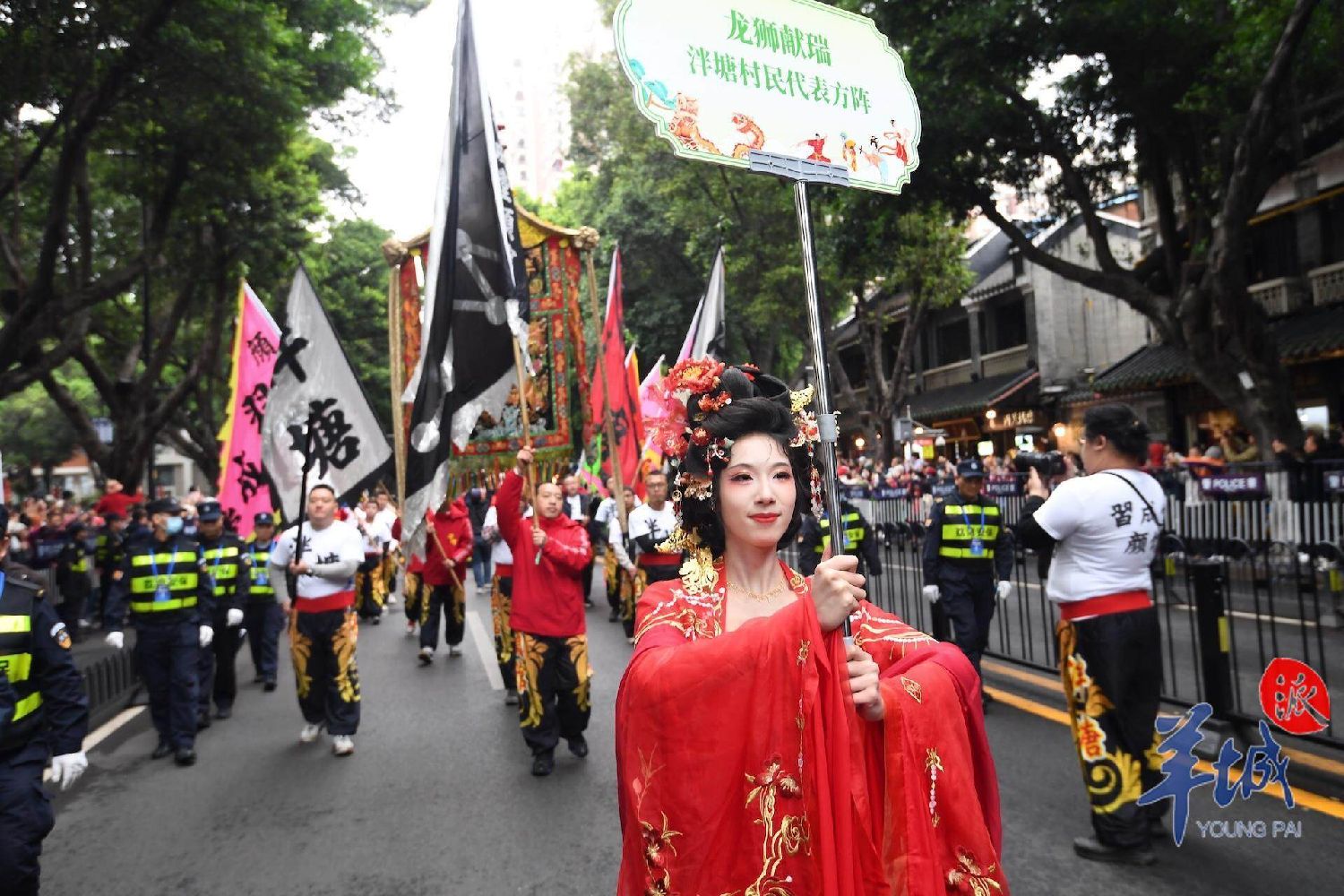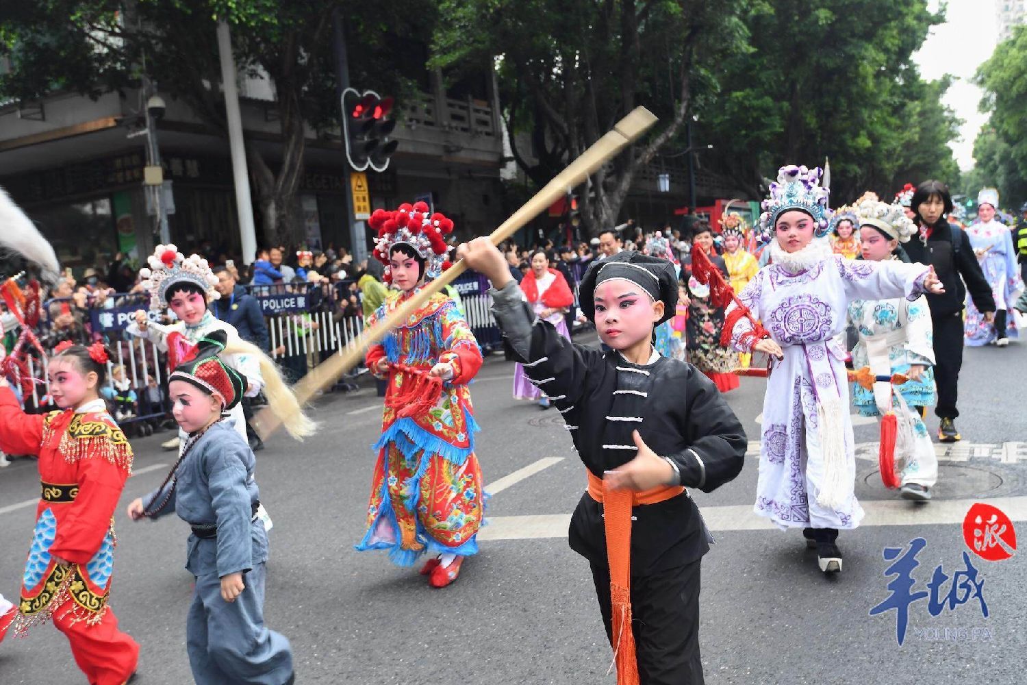 去年火爆出圈,深受市民游客喜爱的民俗巡游也在当天上演,15个巡游方阵逐一亮相。“巨型版”的泮塘五秀——马蹄、莲藕、茭白、慈姑、菱角在街巷中穿梭;粤剧粤曲、西关小姐、花仙子、木偶剧、麒麟舞等广府元素和热门动漫IP角色轮番登场;十五运会吉祥物和荔湾运动健儿作为特别嘉宾亮相……巡游队伍沿着仁威庙、泮塘路、荔枝湾石、荔枝湾涌、荔湾博物馆、五秀广场、环湖碧道等地进行巡游,最后回到仁威庙。