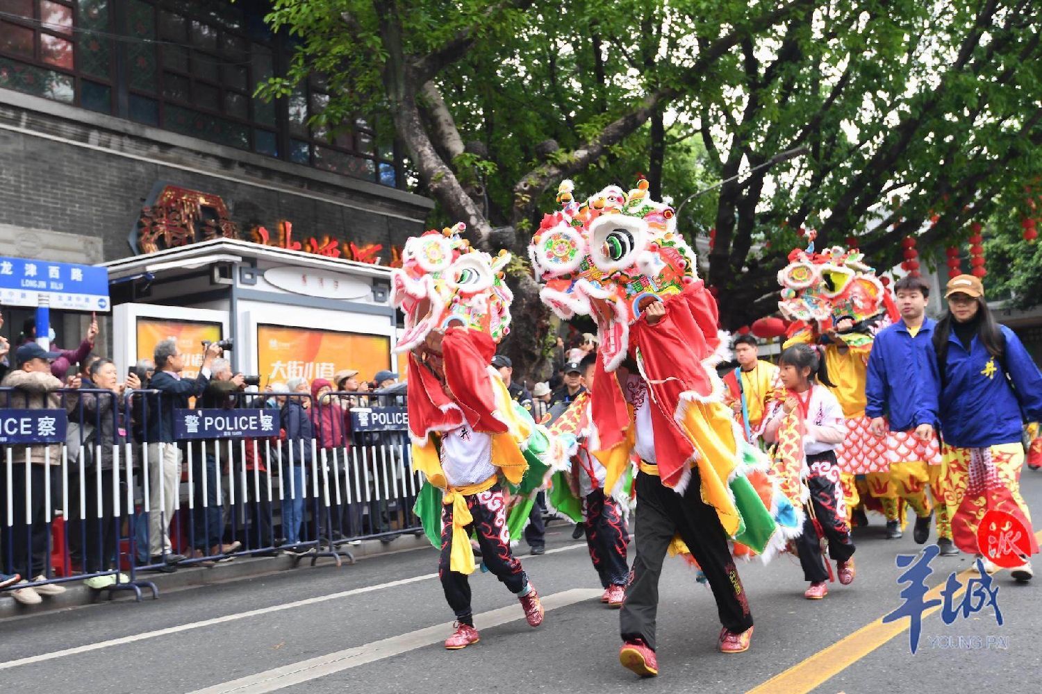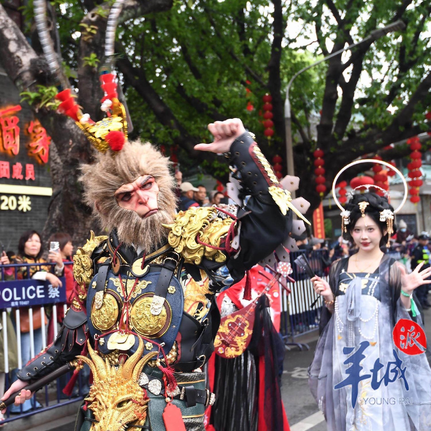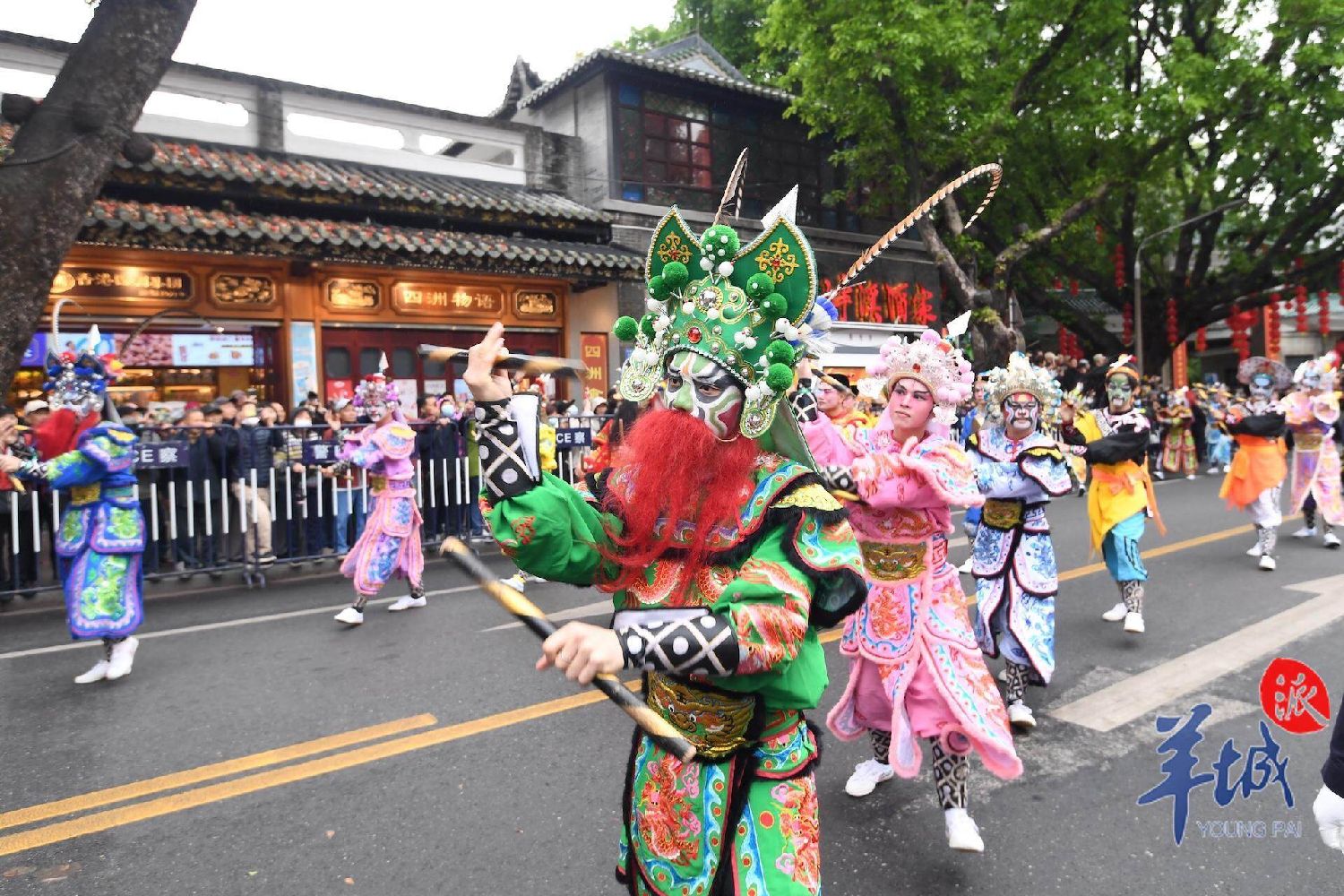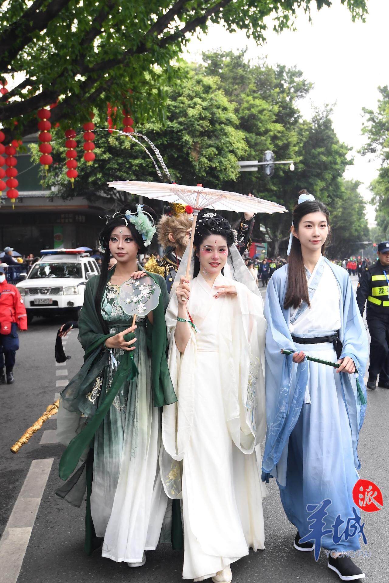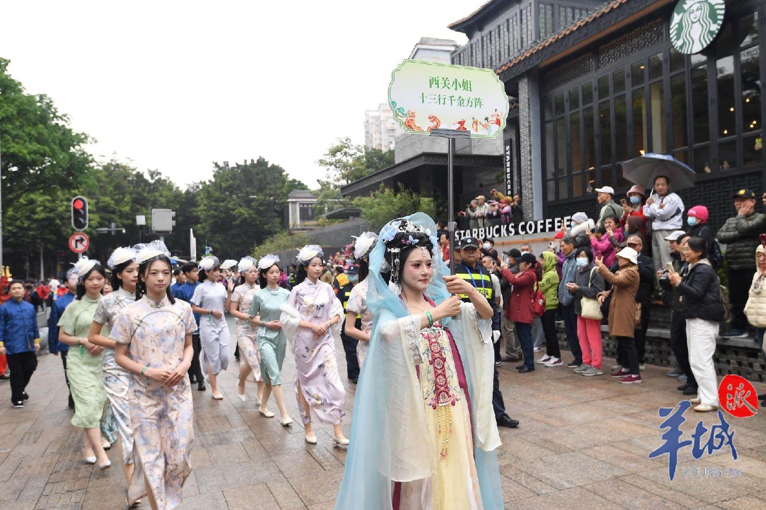 去年火爆出圈,深受市民游客喜爱的民俗巡游也在当天上演,15个巡游方阵逐一亮相。“巨型版”的泮塘五秀——马蹄、莲藕、茭白、慈姑、菱角在街巷中穿梭;粤剧粤曲、西关小姐、花仙子、木偶剧、麒麟舞等广府元素和热门动漫IP角色轮番登场;十五运会吉祥物和荔湾运动健儿作为特别嘉宾亮相……巡游队伍沿着仁威庙、泮塘路、荔枝湾石、荔枝湾涌、荔湾博物馆、五秀广场、环湖碧道等地进行巡游,最后回到仁威庙。